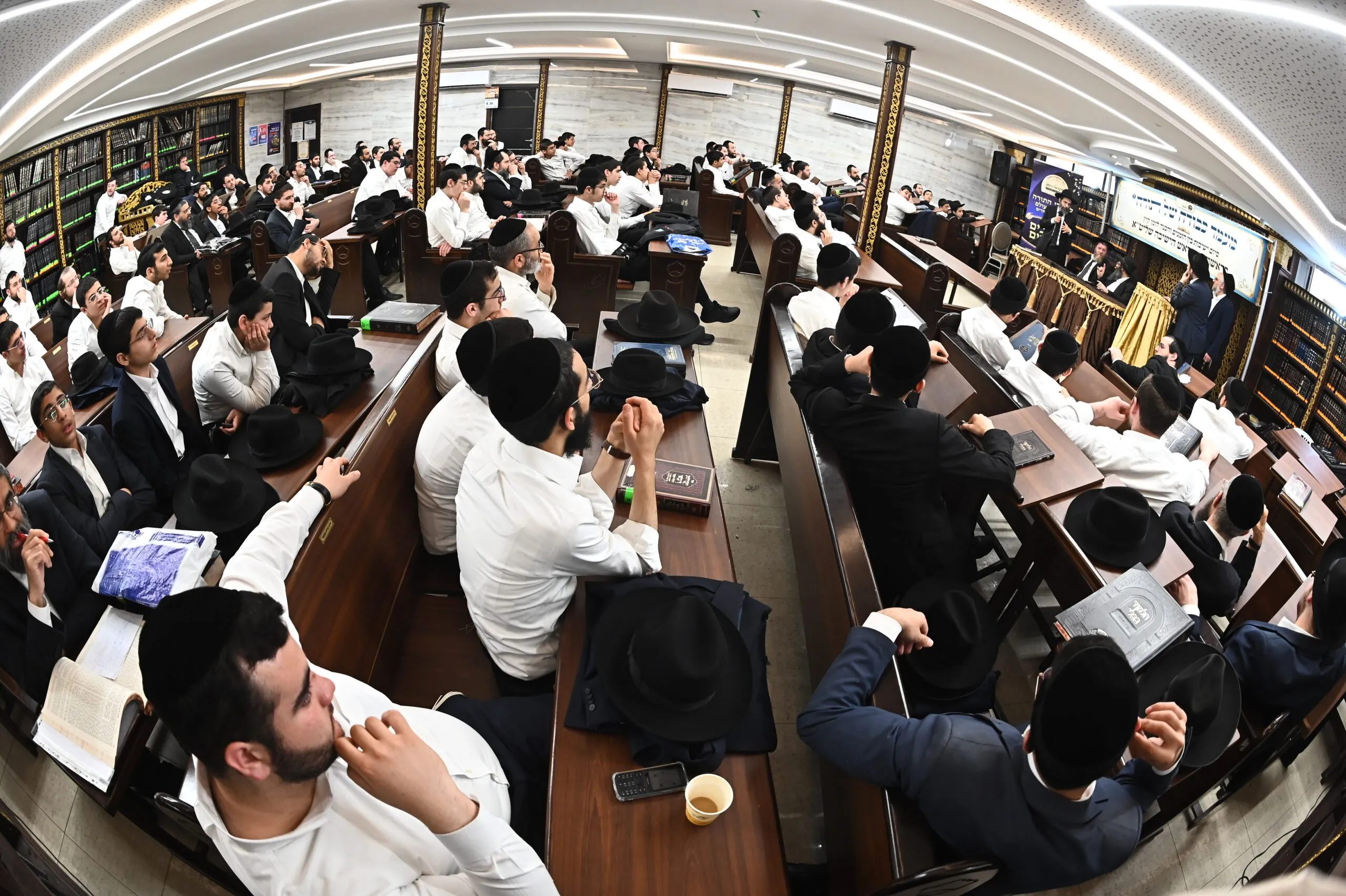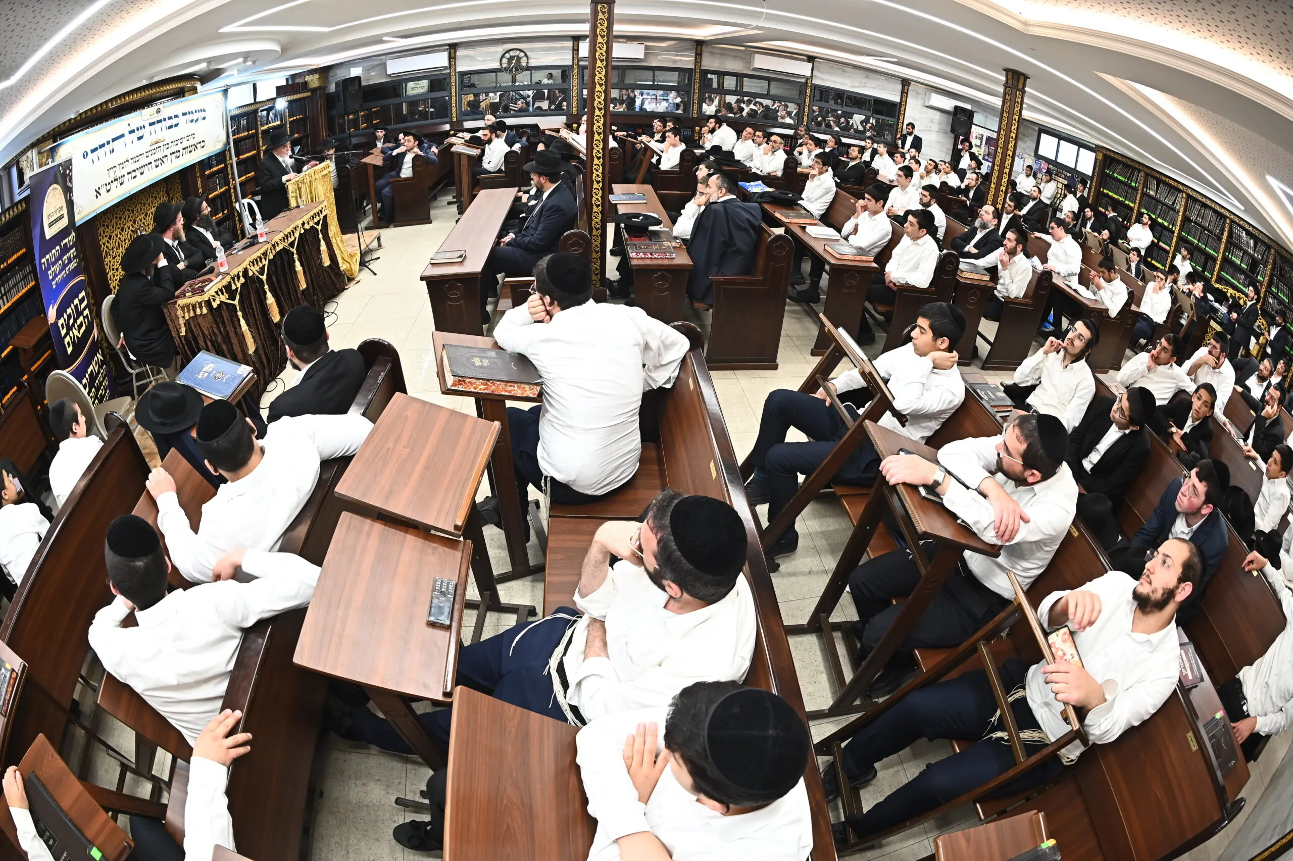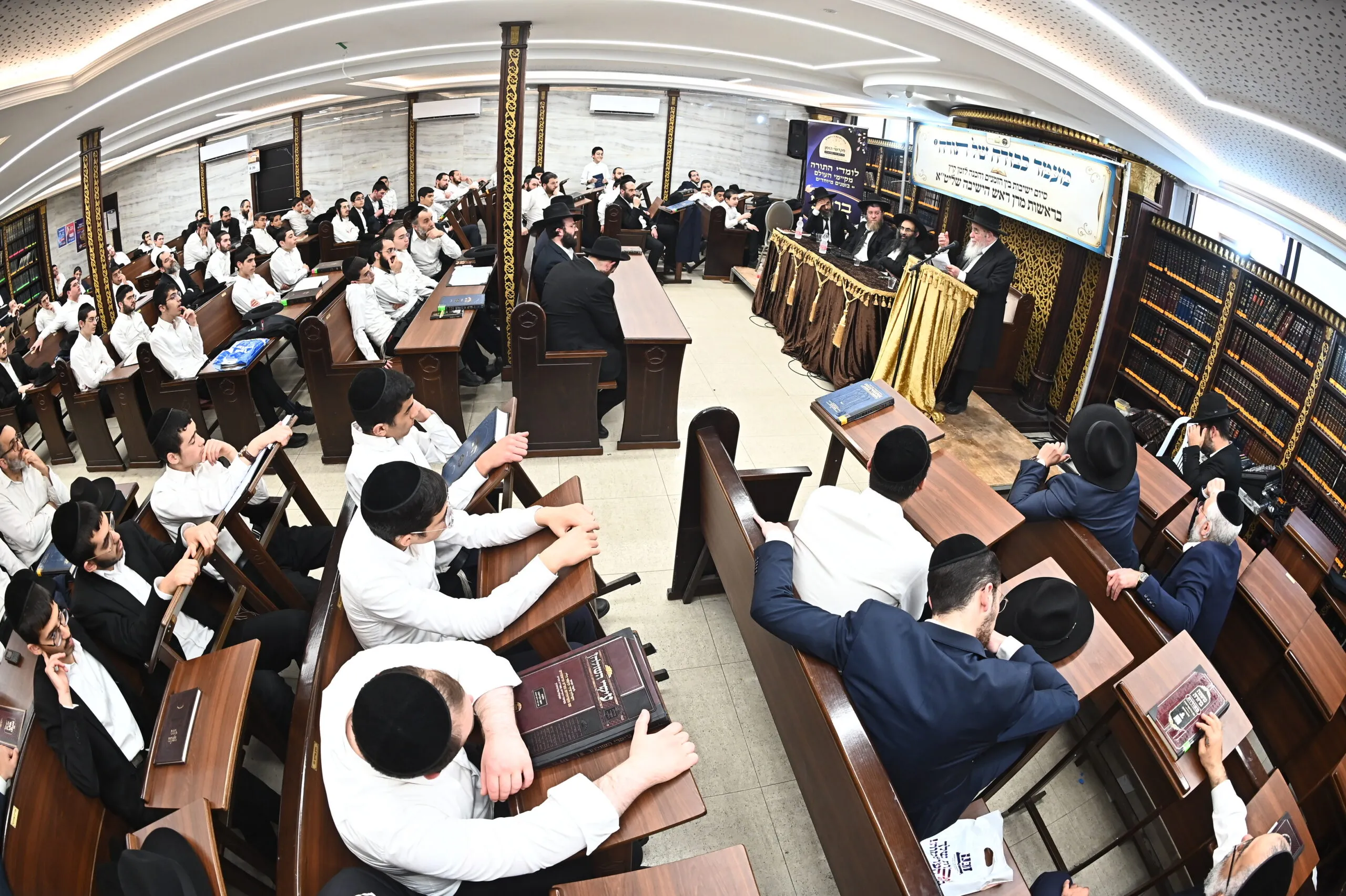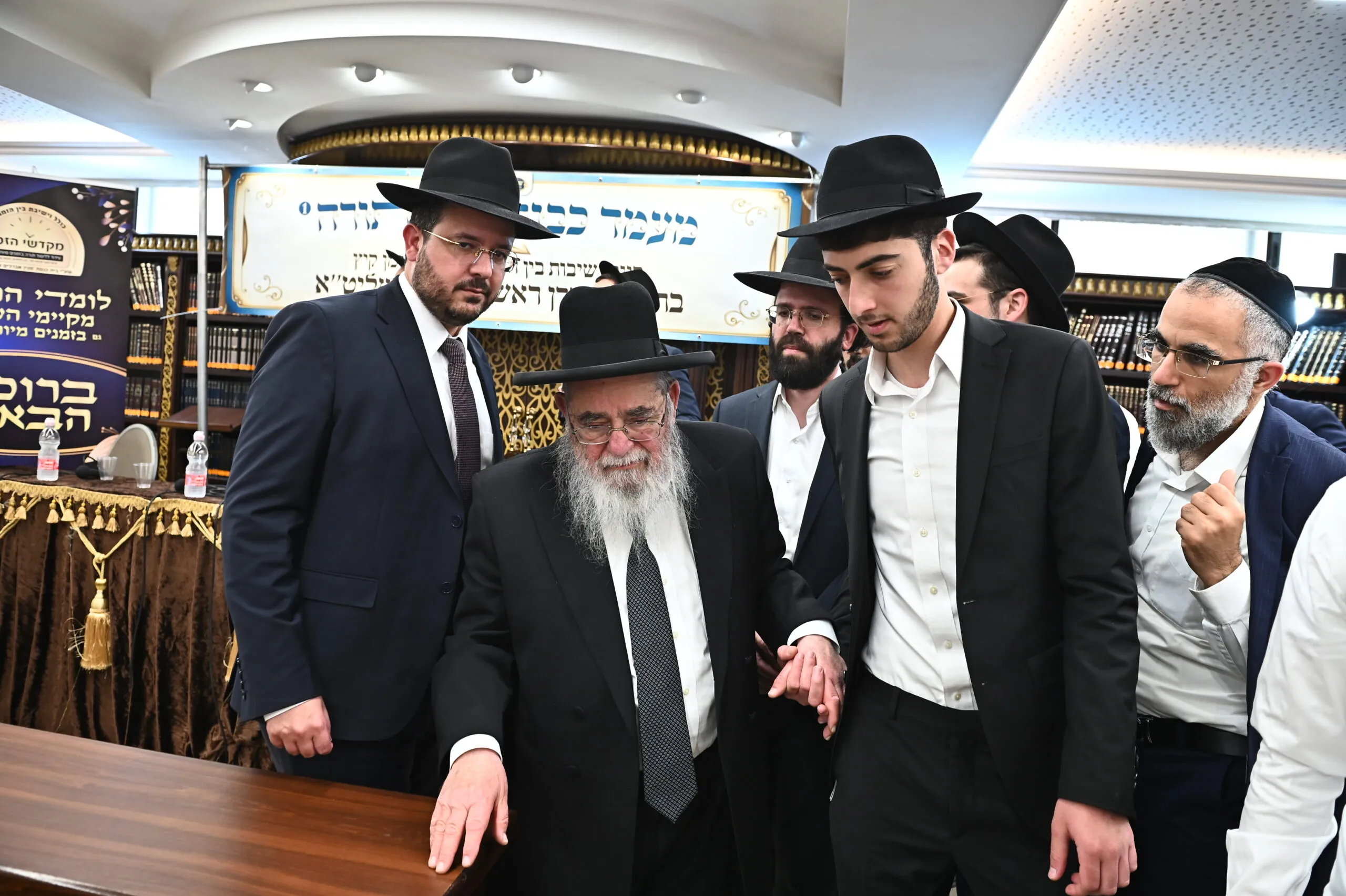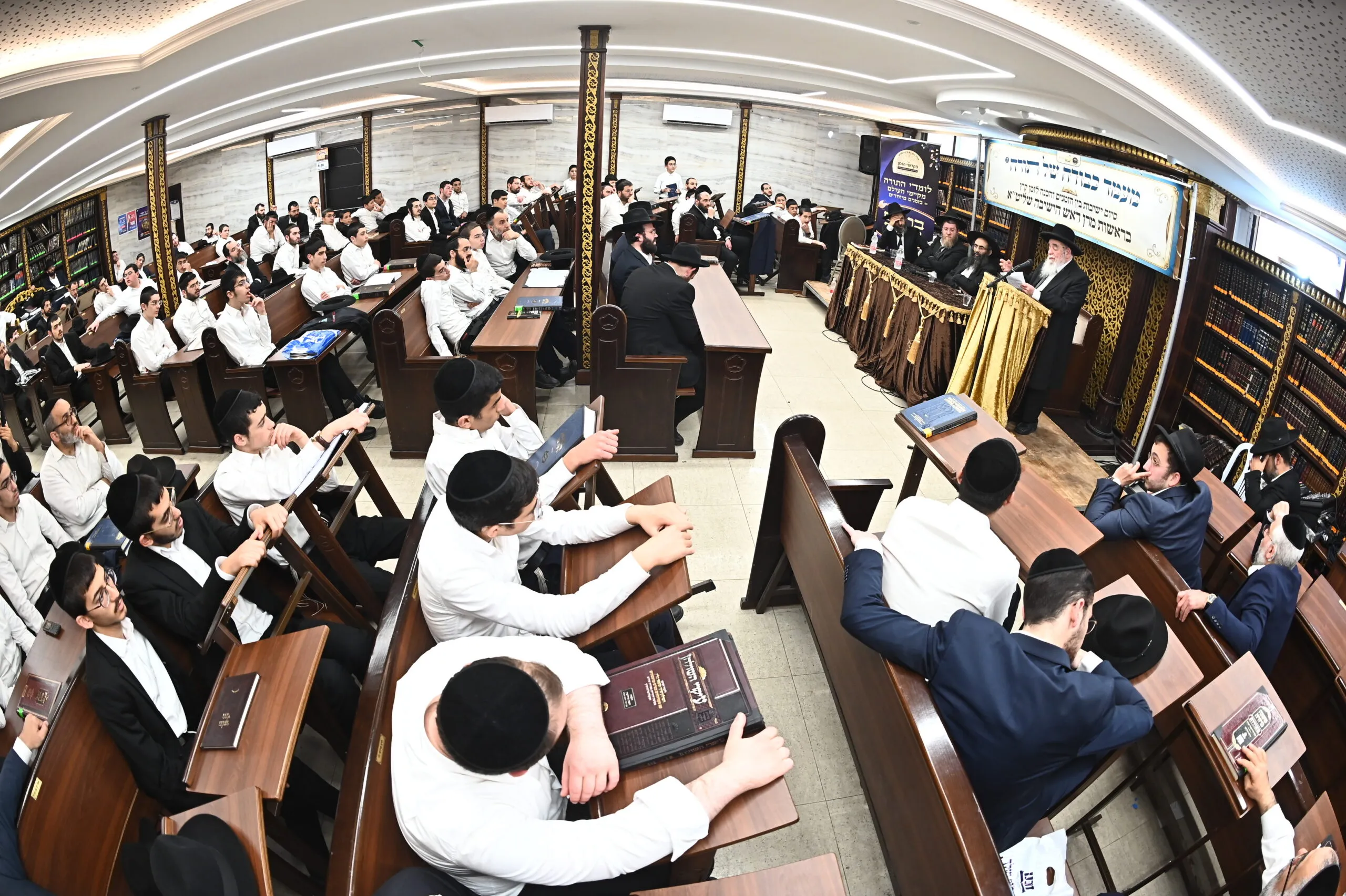 גדולי ראשי הישיבות בראשות מרן ראש הישיבה הגאון הגדול רבי אברהם סאלים בריתחא דאורייתא במעמד "כבודה של תורה" בביהמ"ד מנין אברכים שיכון ה' בבני ברק . צילום: שוקי לרר